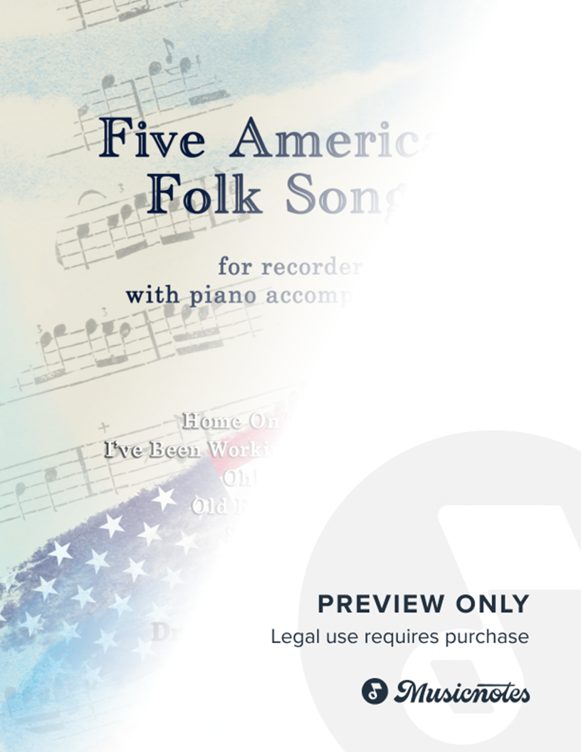 Arrangements of the following five American folk songs for Recorder with Piano accompaniment: Home On The Range I’ve Been Working On The Railroad Oh! Susanna Old Folks At Home Shenandoah A full score is provided for each song in addition to individual parts.