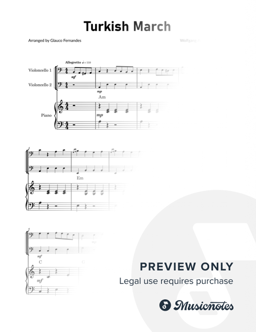 Rondo Alla Turca (Turkish March) - Mozart | EASY CELLO DUET & PIANO (with Chords) Easy arrangement for two Cellos and Piano with chords. A fun classical piece for students. Includes score and parts.