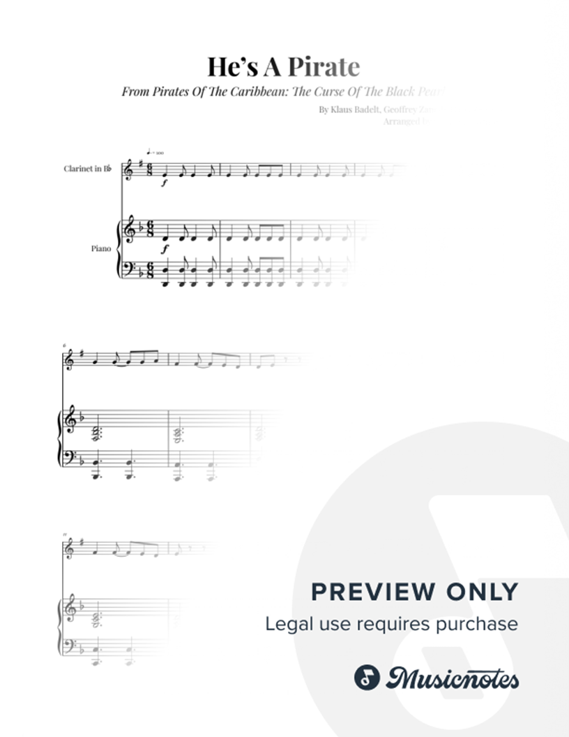 He's A Pirate - Pirates of the Caribbean | CLARINET & PIANO (Easy/Intermediate) Easy/Intermediate Clarinet and Piano arrangement. Includes score and parts.