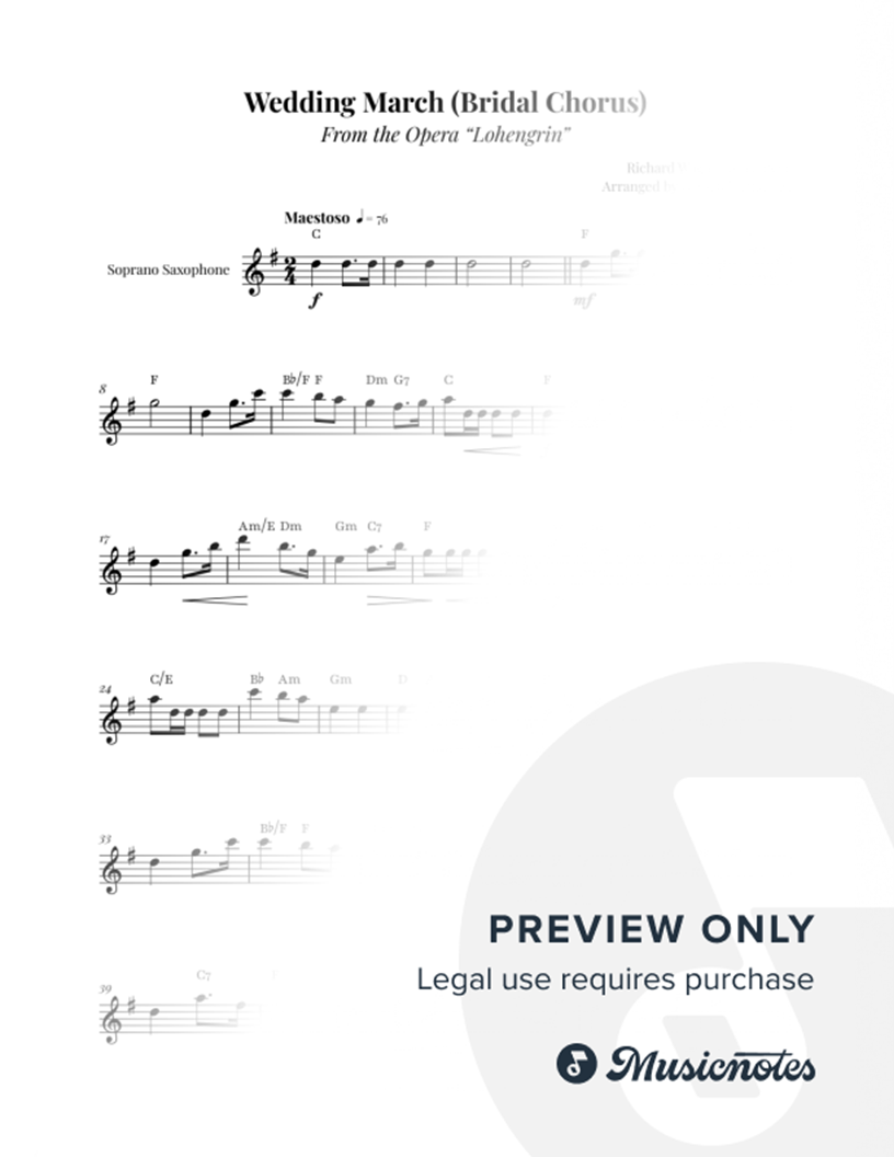 Wedding March (Bridal Chorus) | SOPRANO SAXOPHONE SOLO (with Chords) Practical soprano saxophone arrangement for weddings. Easy/intermediate level with chords. Ideal for soloists needing a majestic, clear sound with minimal rehearsal time. Includes score and parts.