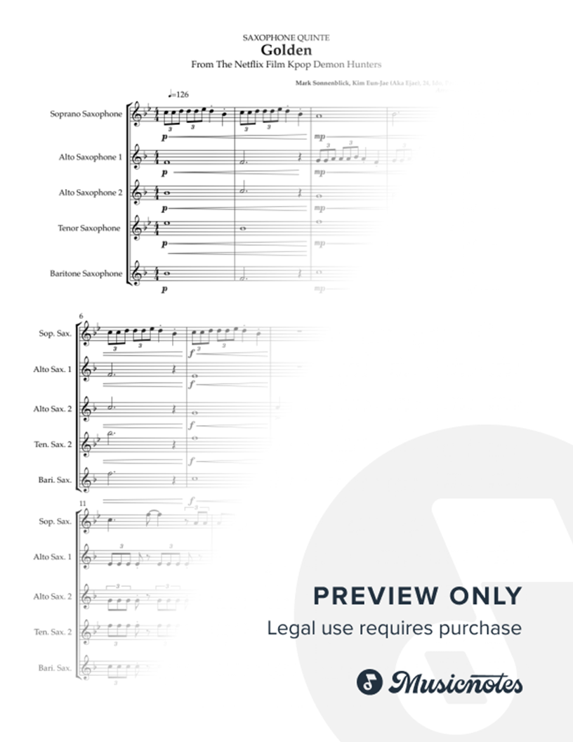Soprano Saxophone Alto Saxophone 1 2 Tenor Saxophone Baritone Saxophone Difficulty: Intermediate / Advanced (Features tight rhythmic sections and powerful unisons) Style: Epic K-Pop / Cinematic Pop Vibe: Massive, Golden, and Energetic Included: Full Score & Individual Parts (High-quality PDF)