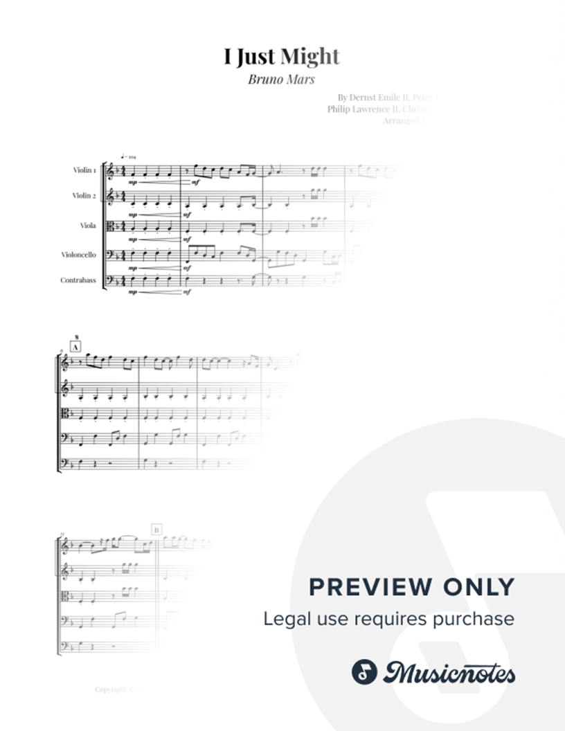 I Just Might - Bruno Mars | STRING QUINTET Essential pop hit for string ensembles. This intermediate version for two violins, viola, cello, and double bass (or two cellos) provides a clear, accurate representation of the song.