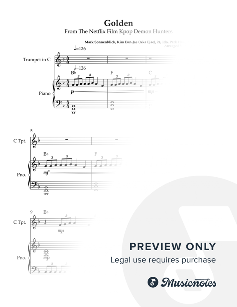 Demon Hunter (Golden Kpop) | Emotional & Powerful Arrangement for Trumpet in C/Piano Perfect for Duets: Great for recitals, busking, or YouTube covers. Intermediate Friendly: Accessible yet professional-sounding flourishes for both instruments.