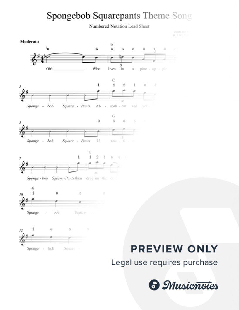SpongeBob SquarePants Theme Song - Lead Sheet (Numbered Pitch Guide / NPG) |