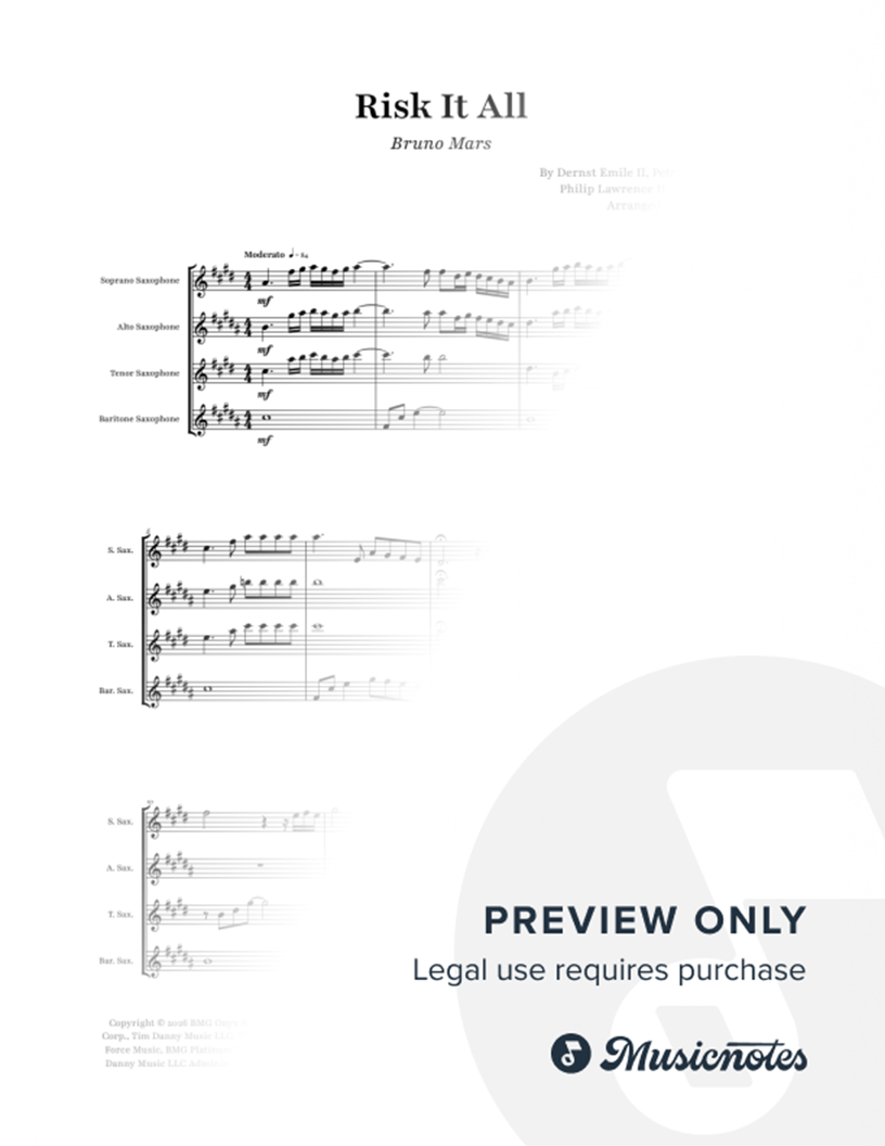 Risk It All - Bruno Mars | Saxophone Quartet Saxophone Quartet (Soprano, Alto, Tenor, Baritone) for Risk It All by Bruno Mars. Ideal for weddings, events, students, and teachers. Risk It All by Bruno Mars for Saxophone Quartet.
