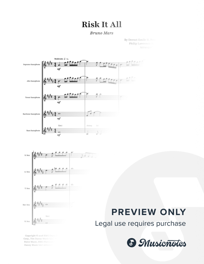 Risk It All - Bruno Mars | Saxophone Quintet with Chords Saxophone Quintet (Soprano, Alto, Tenor, Baritone, Bass) with Chords for Risk It All by Bruno Mars. Ideal for weddings, events, students, and teachers. Risk It All by Bruno Mars for Saxophone Quintet with Chords.