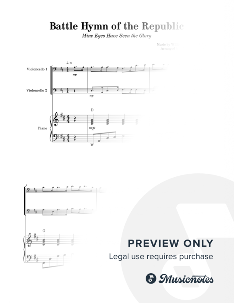 Battle Hymn of the Republic | CELLO DUET with Piano & Chords Sheet music for 2 Cellos and Piano with Chords by William Steffe. Includes score and individual parts. Ideal for patriotic events, students, and teachers. This CELLO DUET with Piano & Chords is a complete arrangement.