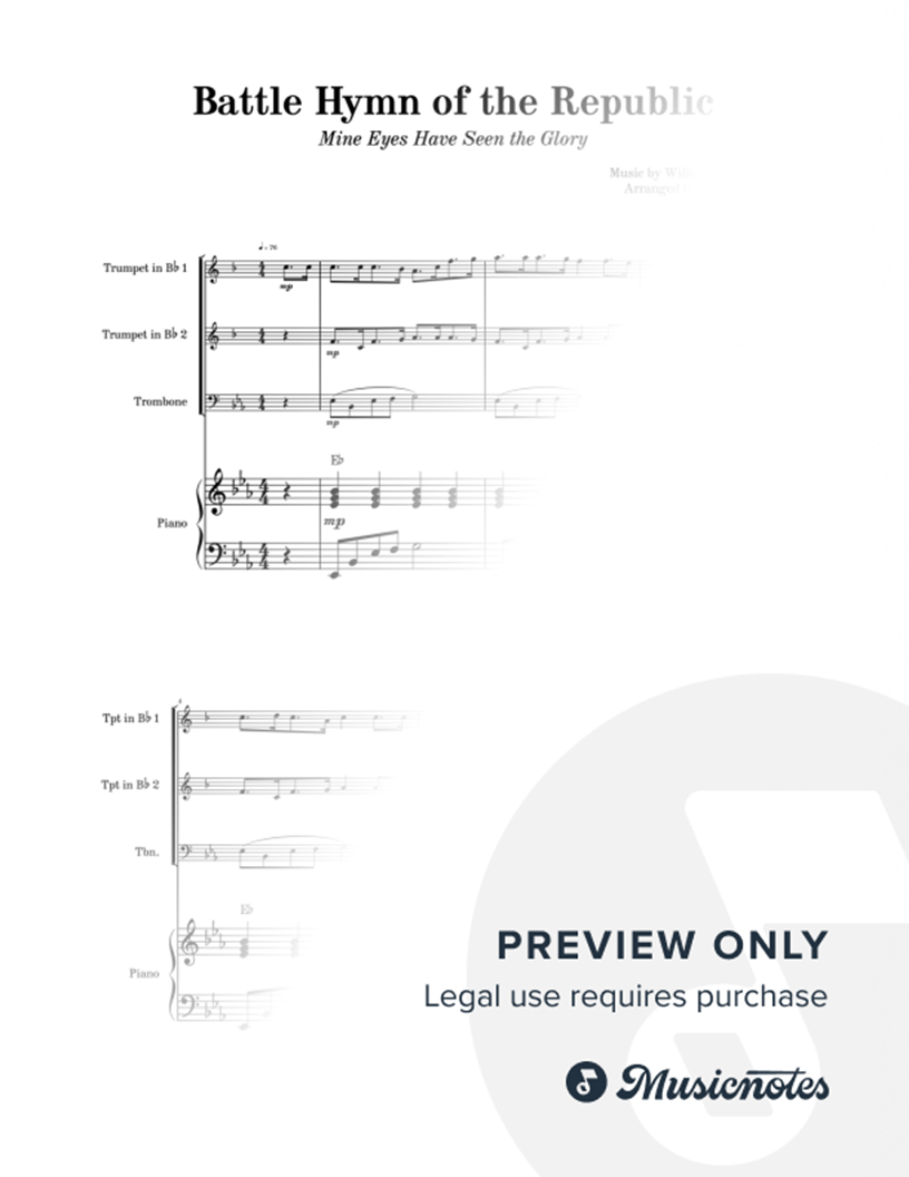 Battle Hymn of the Republic - BRASS TRIO (2 Trumpets & Trombone) with PIANO & Chords Sheet music for 2 Trumpets, Trombone, and piano with chords. Includes score and parts. Technical arrangement for weddings, events, students, and teachers. Intermediate level. This brass trio (2 trumpets & trombone)