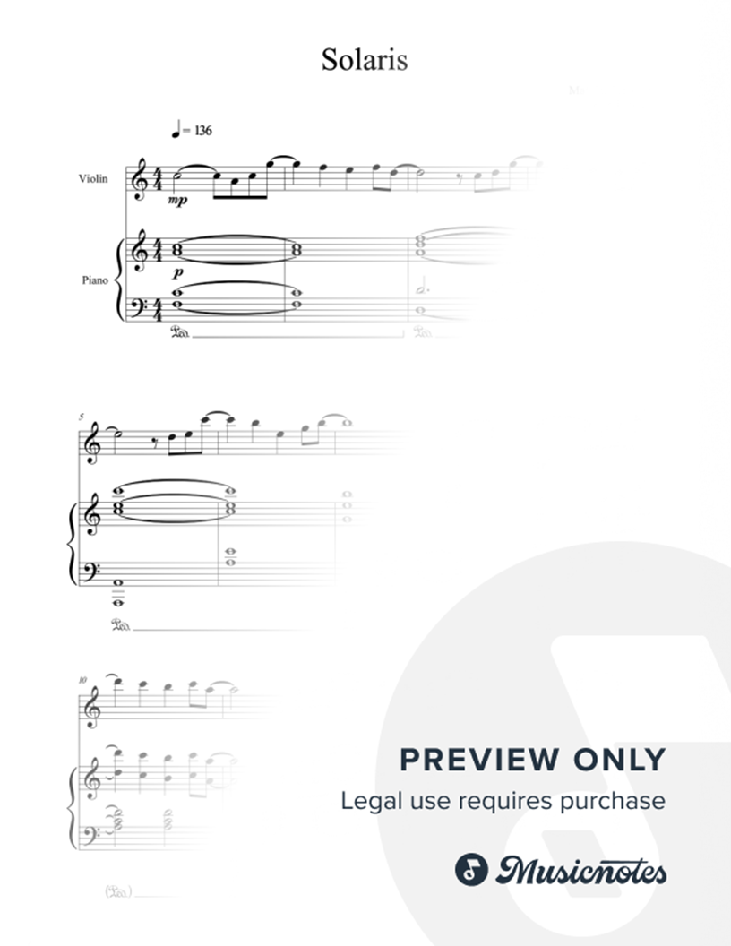Solaris is an original composition by Mathias Fritsche and Rob Landes meant to lift and inspire. This violin and piano arrangement is true to the original melody and harmonies, and violinists of all ability levels will find parts that they enjoy, and will be challenged by.