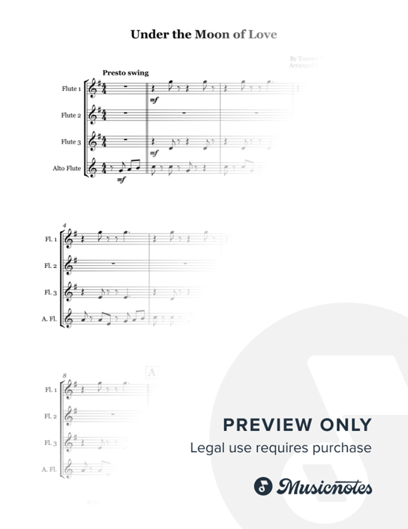 As made famous by Showaddywaddy, Under the Moon of Love is a great retro-sounding pop song that will be a great addition to any quartet's gigging repertoire! Arranged for flute quartet.