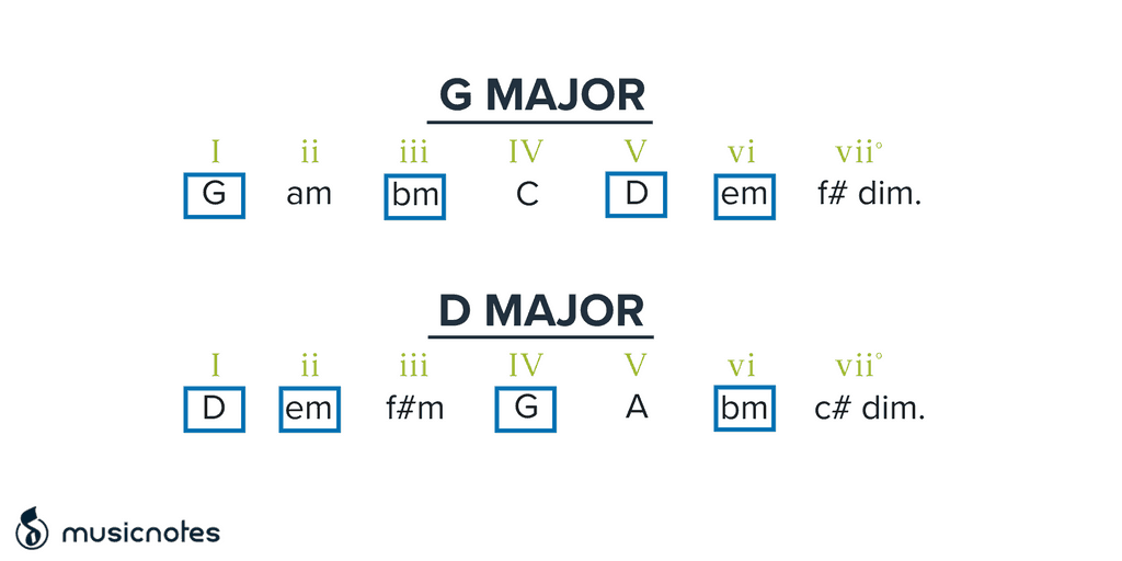 If the song you’re wanting to transition to is not in the same key as the previous song, you’ll at least want the keys to share some of the same chords. For example, it’s pretty easy to transition from G Major to D Major because of their shared chords: