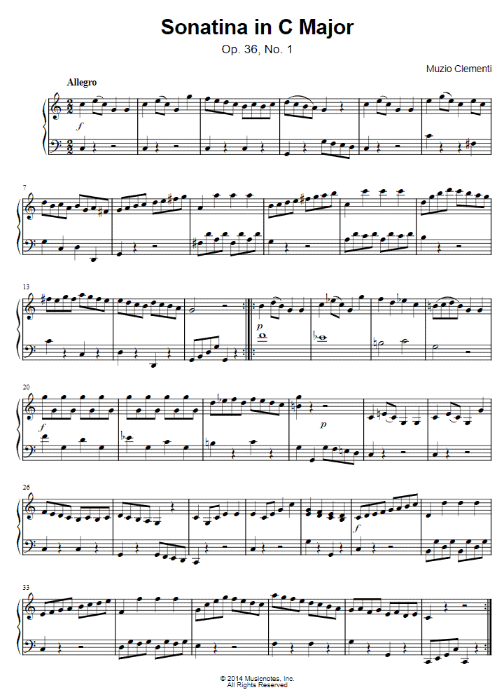 However, this Clementi “Sonatina” also has 4-measure phrases, but you can see that they don’t fall on the page in equal lines. As you are practicing, you’d want to work 4-8 measures at a time rather than line by line.