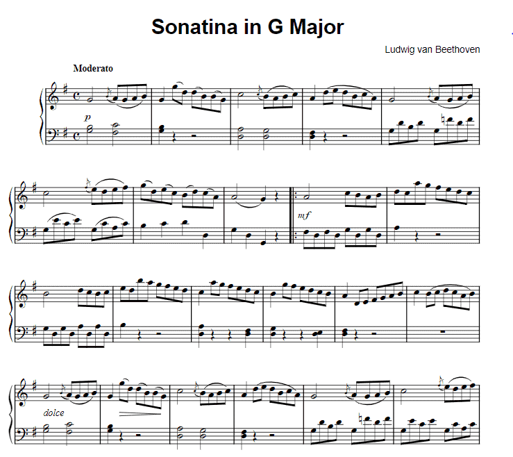 For example, in Beethoven’s “Sonatina in G Major,” the first 8 measures are marked as piano and most of it is legato, but there is no other indication of how to play them. It would make sense to bump up the dynamic a little on the high G in measure 2, so that you could add a slight diminuendo on the descending notes that follow. Then, you could get a little louder again at the end of measure 3, going into measure 4.
