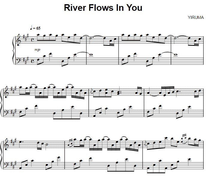The introduction of “River Flows In You” by Yiruma is the exact same 2-bar phrase, 2 times in a row. Even though it is marked soft, you can experiment with making the second phrase sound different from the first. You could get even softer and make it an echo of the first phrase, or it could build and get just a little louder. There’s not a right or wrong way, so you’ll have to decide what suits you the best.