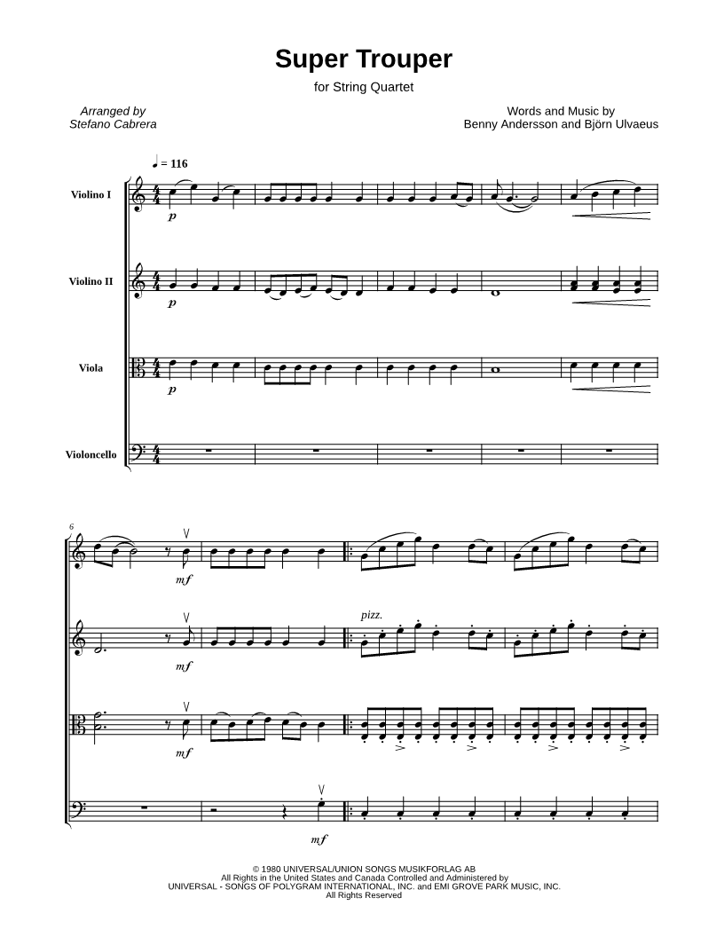 Violin 1, range: D4-C6 Violin 2, range: G3-F5 Viola, range: C3-A4 Cello, range: C2-G3 | |
