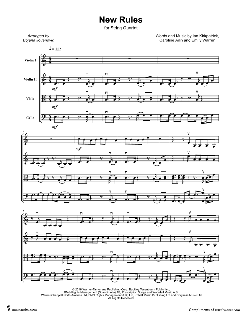 Violin 1, range: G3-C6 Violin 2, range: G3-F5 Viola, range: F3-B4 Cello, range: F2-G3 | |