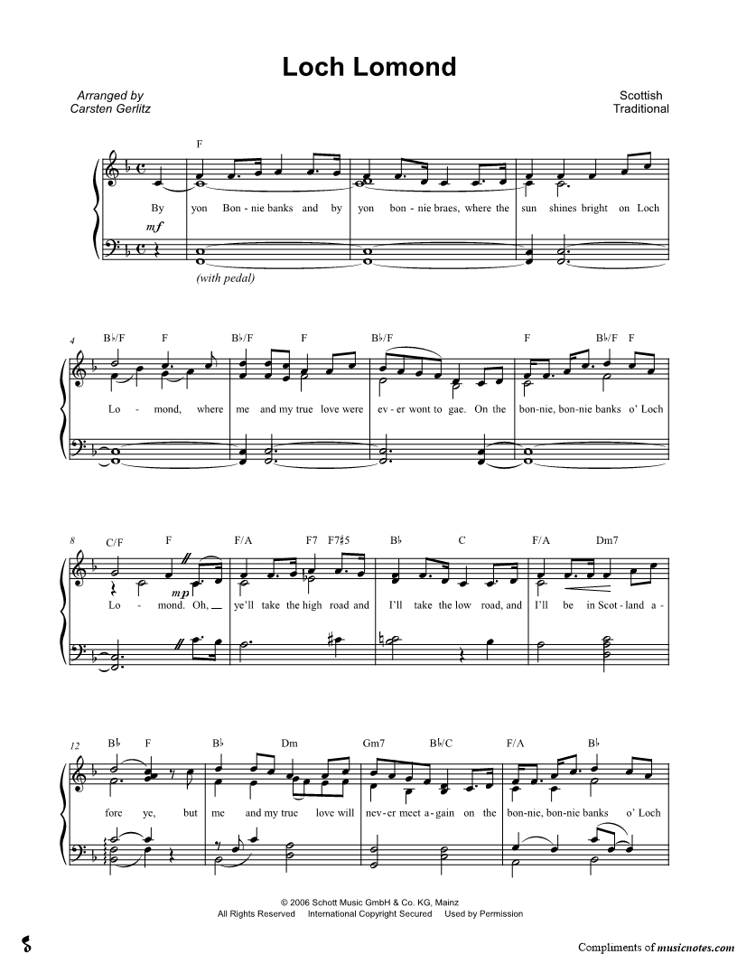 By yon Bonnie banks and by yon bonnie braes, where the sun shines bright on Loch Lomond, where me and my true love were ever wont to gae. |