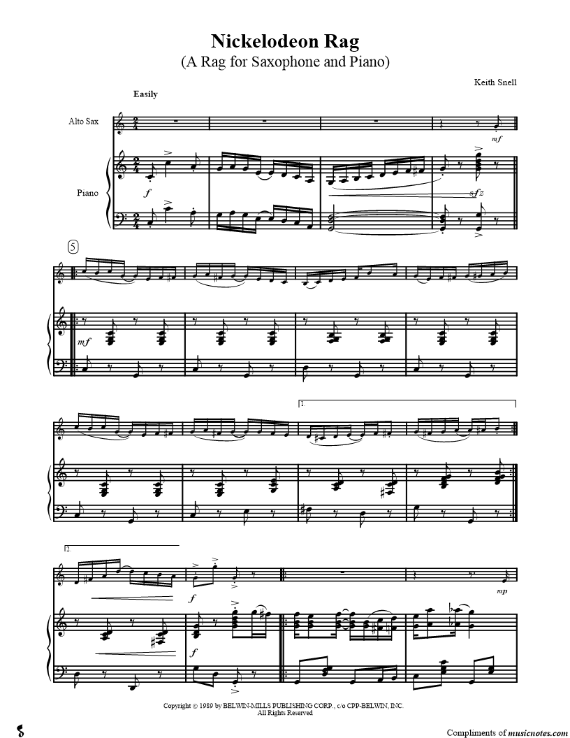 1. Nickelodeon Rag - Piano Accompaniment (click here to preview and play this piece) Composer: Scored For:Score, Solo & Accompaniment and Instrumental Part Instruments:Piano Accompaniment and Alto Saxophone, range: B3-G5 Number of pages:3 Click here to purchase this piece separately for $4.99 |