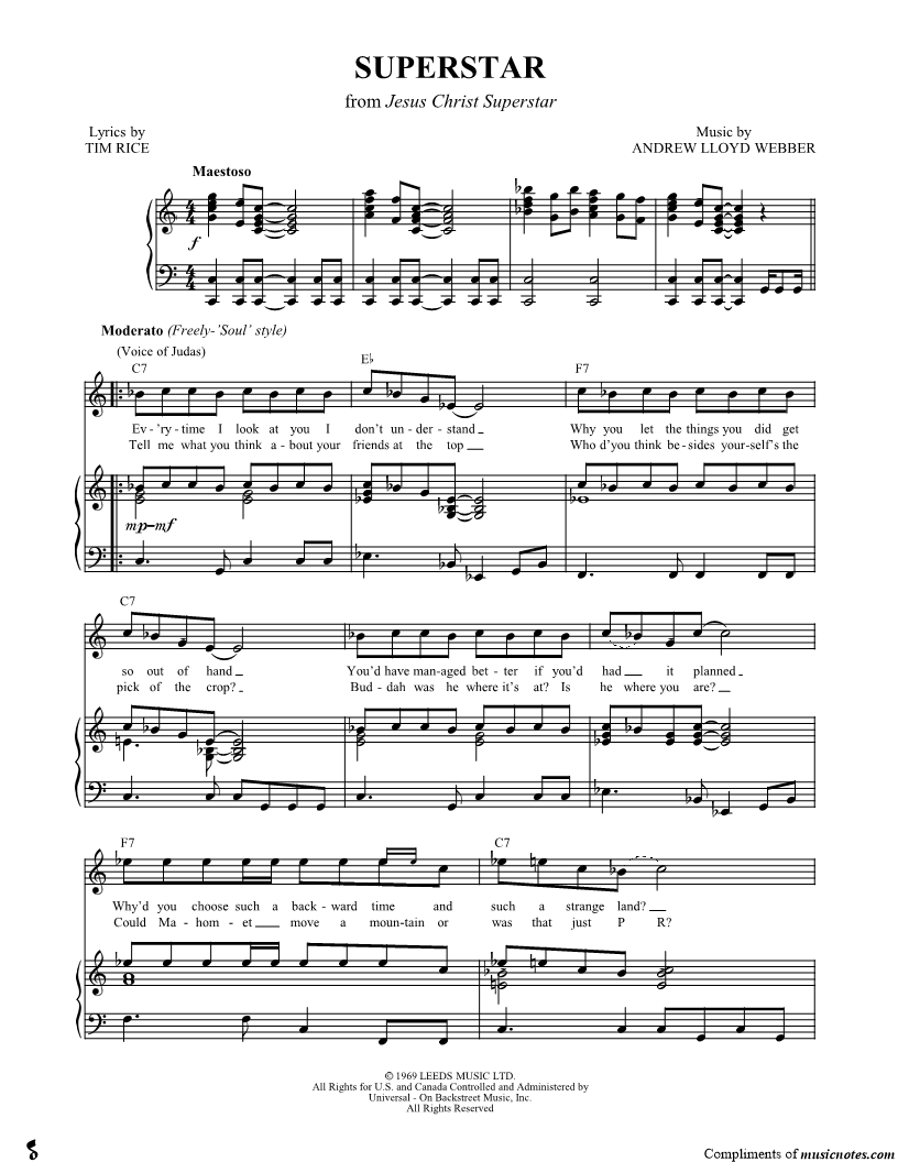 1. Superstar (click here to preview and play this piece) Composer: Lyricist: Scored For:Piano/Vocal/Chords Instruments:Piano, range: Bb1-Bb5 and Voice, range: C4-F6 Number of pages:4 Click here to purchase this piece separately for $5.99 |