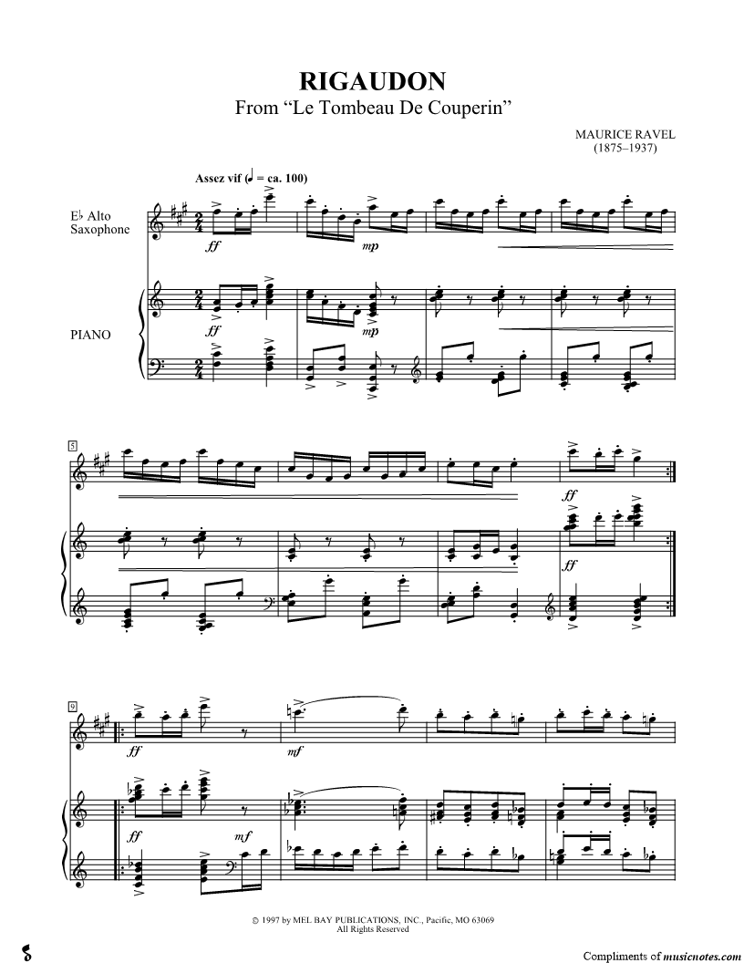 2. Le Tombeau de Couperin: Rigaudon (click here to preview and play this piece) Composer: Scored For:Instrumental Part Instrument:Alto Saxophone, range: E4-E6 Number of pages:2 Click here to purchase this piece separately for $4.99 |