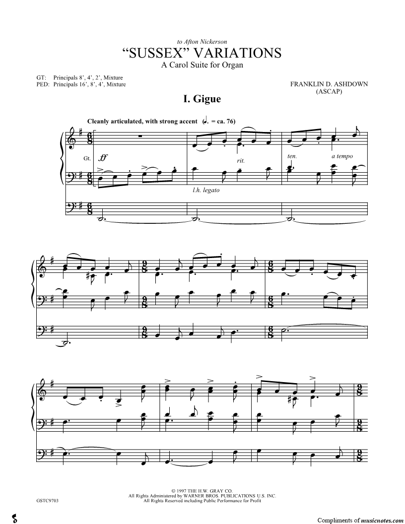 1. I. Gigue (click here to preview and play this piece) Composer: Scored For:Instrumental Solo Instrument:Organ Number of pages:2 Click here to purchase this piece separately for $5.99 |