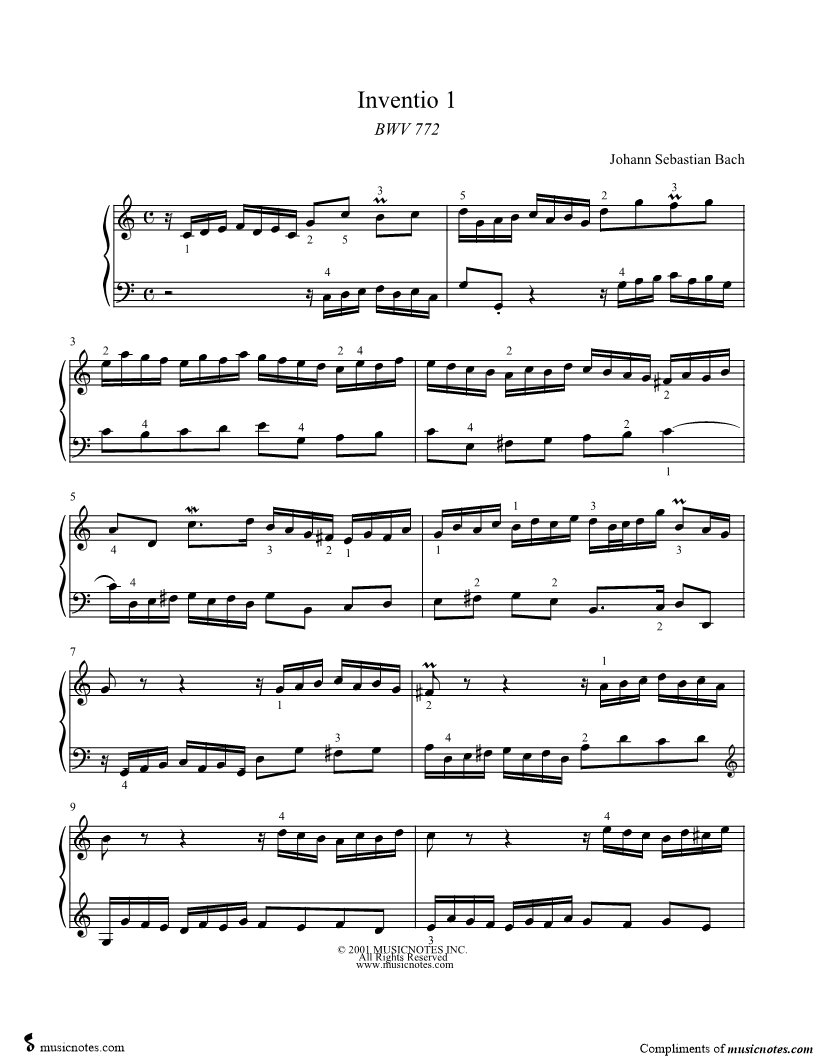 1. Two Part Invention No. 1, BWV 772 (click here to preview and play this piece) Composer: Scored For:Instrumental Solo Instrument:Piano Number of pages:2 Click here to purchase this piece separately for $5.99 |