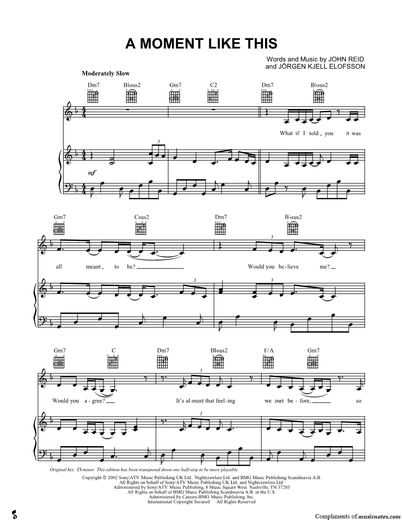 1. A Moment Like This (click here to preview and play this piece) Performer: Composers: Lyricists: Scored For:Piano/Vocal/Guitar Instruments:Voice, Piano and Guitar Number of pages:8 Click here to purchase this piece separately for $5.99 |