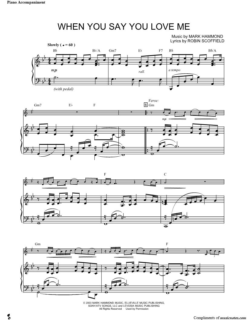 1. When You Say You Love Me (click here to preview and play this piece) Performer: Composer: Lyricist: Scored For:Solo & Accompaniment Instrument:Piano Accompaniment Number of pages:4 Click here to purchase this piece separately for $4.99 |