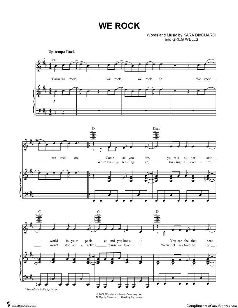 1. We Rock (click here to preview and play this piece) Composers: Lyricists: Scored For:Piano/Vocal/Guitar Instruments:Voice, range: C#4-E5, Piano and Guitar Number of pages:6 Click here to purchase this piece separately for $5.99 |