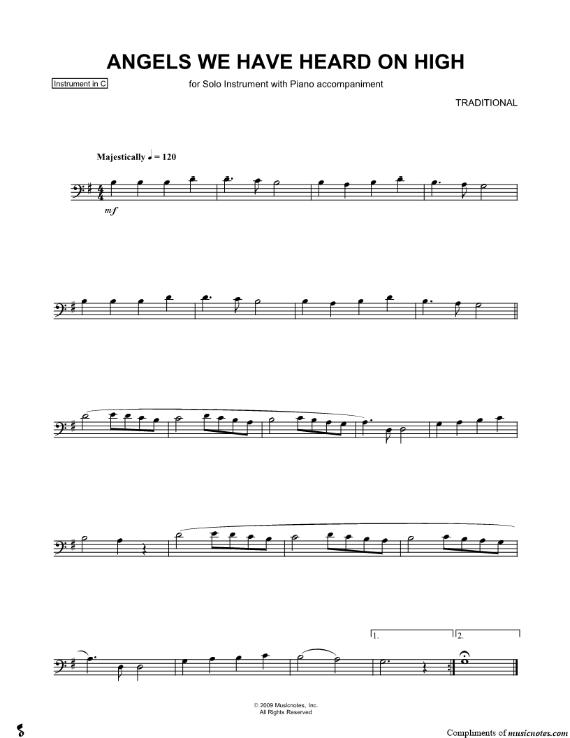 1. Angels We Have Heard on High - Bass Clef Instrument (click here to preview and play this piece) Composer: Lyricist: Scored For:Instrumental Solo Instruments:Bass Clef Instrument, range: D3-E4, Cello, Double Bass, Trombone, Bassoon and Baritone Horn Number of pages:1 Click here to purchase this piece separately for $4.99 |