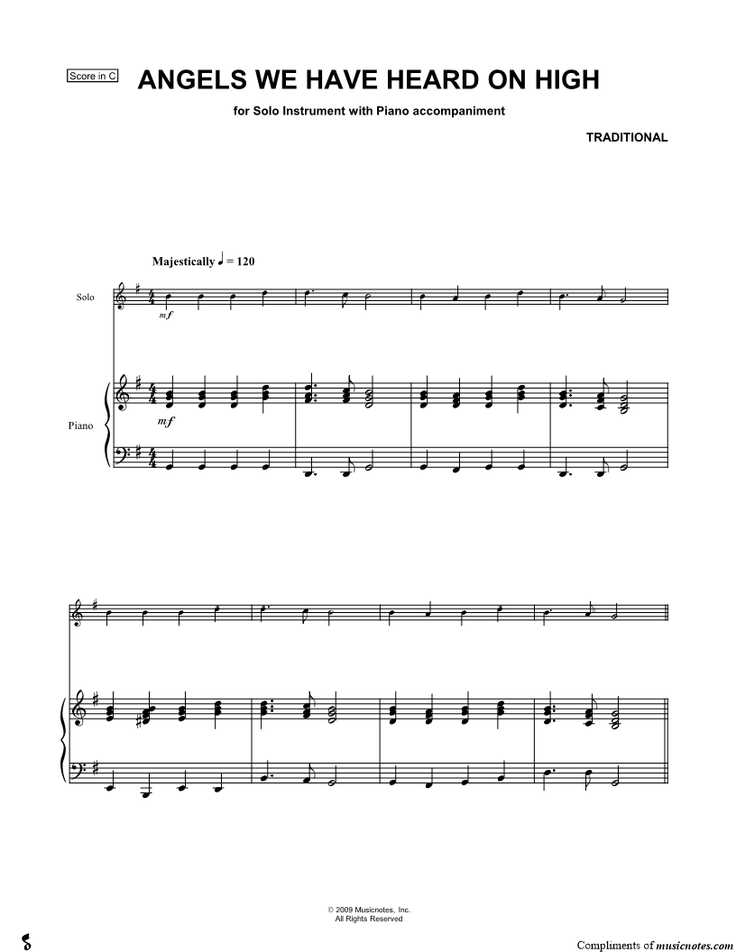 1. Angels We Have Heard on High - Piano Accompaniment (click here to preview and play this piece) Composer: Lyricist: Scored For:Instrumental Part and Solo & Accompaniment Instruments:Piano Accompaniment, C Instrument, range: D4-E5, Violin, Oboe, Flute and Recorder Number of pages:2 Click here to purchase this piece separately for $4.99 |