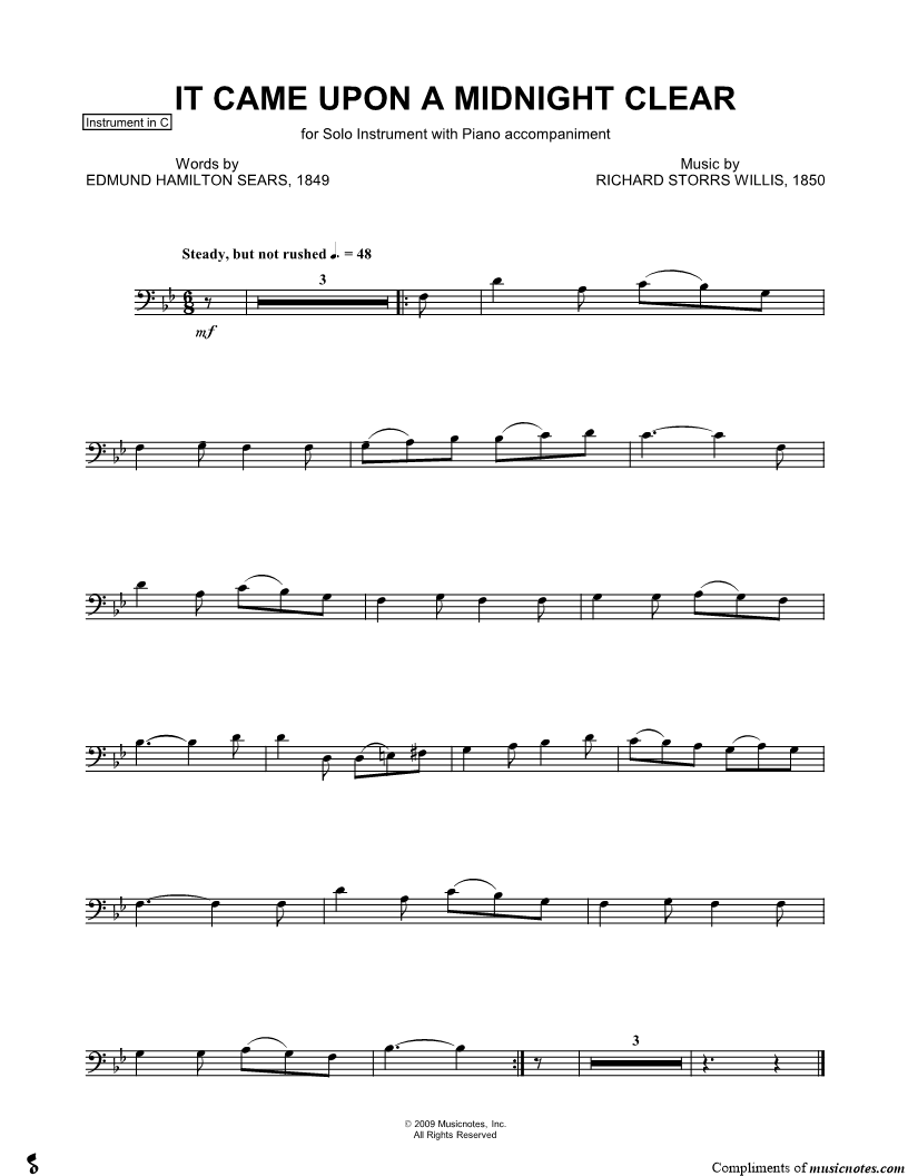 1. It Came Upon a Midnight Clear - Bass Clef Instrument (click here to preview and play this piece) Composer: Lyricist: Scored For:Instrumental Part Instruments:Bass Clef Instrument, range: D3-D4, Cello, Double Bass, Trombone, Bassoon and Baritone Horn Number of pages:1 Click here to purchase this piece separately for $4.99 |