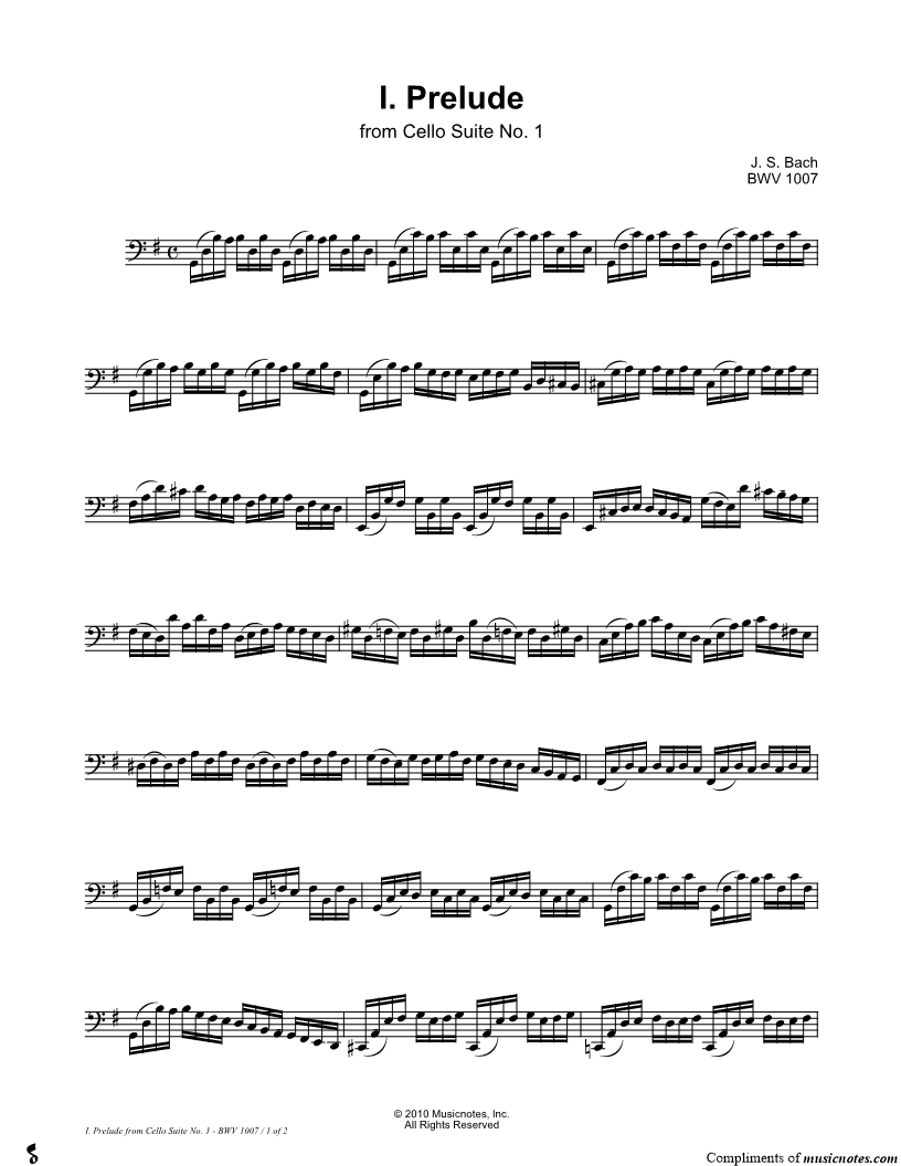 1. Cello Suite No. 1, BWV 1007: I. Prelude (click here to preview and play this piece) Composer: Scored For:Instrumental Solo Instrument:Cello, range: C2-G4 Number of pages:2 Click here to purchase this piece separately for $4.99 |