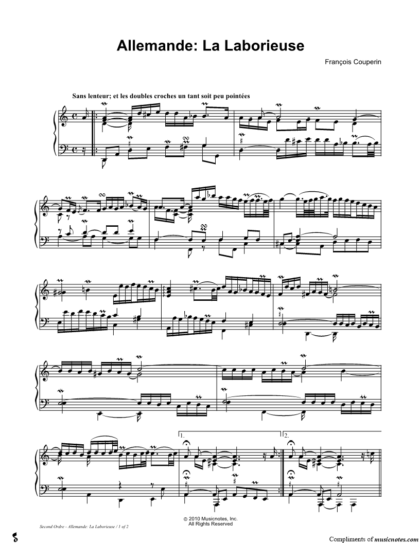 1. Allemande: La Laborieuse (click here to preview and play this piece) Composer: Scored For:Instrumental Solo Instrument:Piano Number of pages:2 Click here to purchase this piece separately for $5.99 |