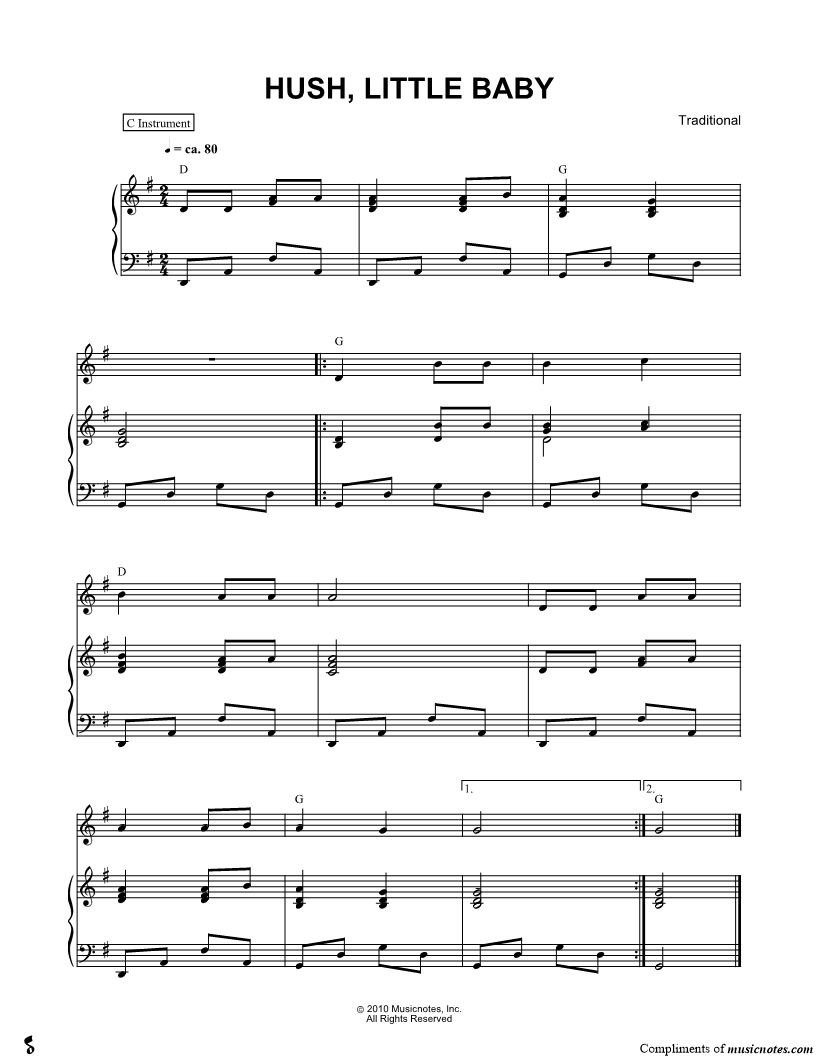 1. Hush, Little Baby - Piano Accompaniment (click here to preview and play this piece) Composer: Lyricist: Scored For:Instrumental Part and Solo & Accompaniment Instruments:Piano Accompaniment, C Instrument, Oboe, Violin, Recorder and Flute Number of pages:1 Click here to purchase this piece separately for $4.99 |