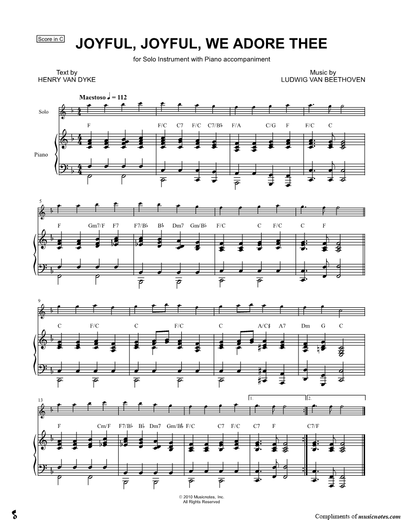 1. Joyful, Joyful, We Adore Thee - Piano Accompaniment (click here to preview and play this piece) Composer: Lyricist: Scored For:Solo & Accompaniment and Instrumental Part Instruments:Piano Accompaniment, C Instrument, range: C5-C6, Oboe, Recorder, Violin and Flute Number of pages:1 Click here to purchase this piece separately for $4.99 |