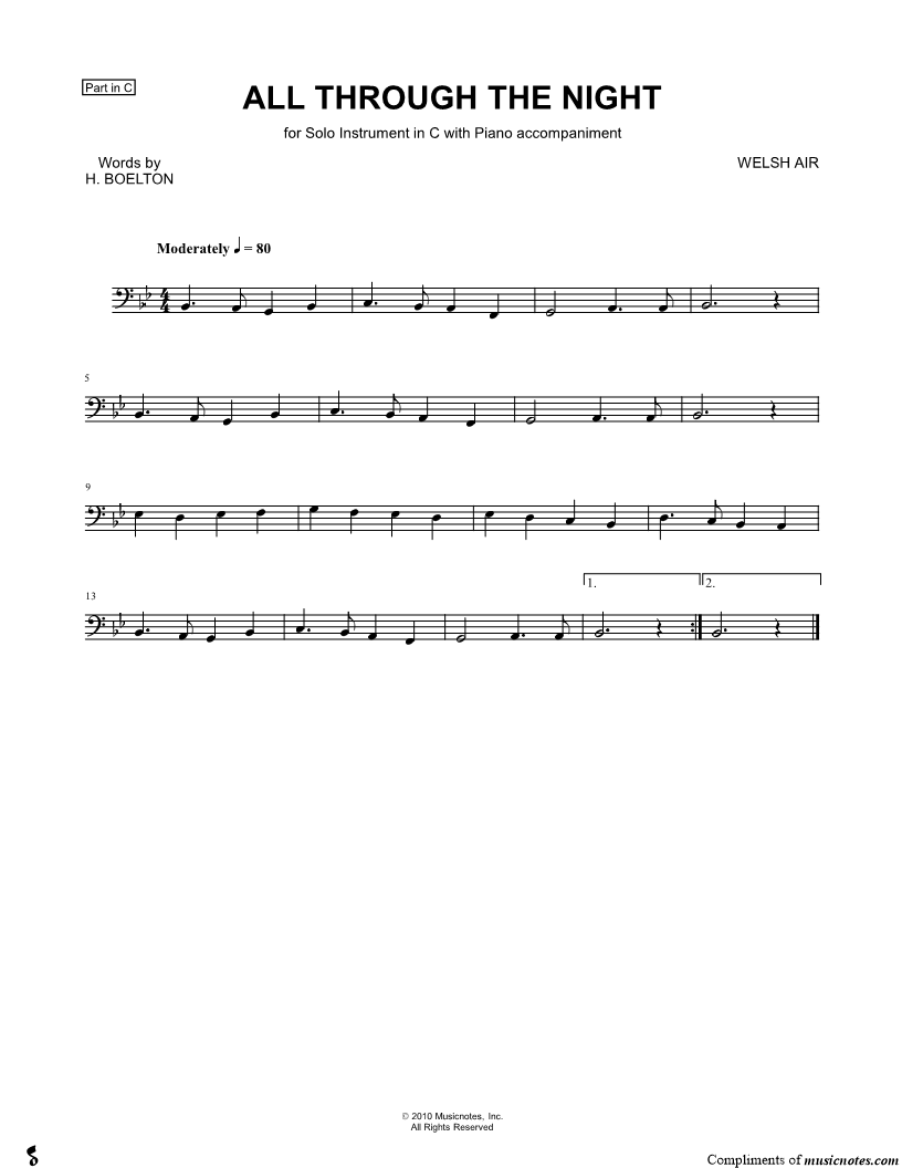 1. All Through the Night - Bass Clef Instrument (click here to preview and play this piece) Composer: Lyricist: Scored For:Instrumental Solo and Instrumental Part Instruments:Bass Clef Instrument, range: F2-G3, Trombone, Bassoon, Baritone Horn, Cello and Double Bass Number of pages:1 Click here to purchase this piece separately for $4.99 |