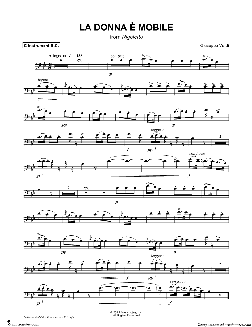 1. La donna è mobile - Bass Clef Instrument (click here to preview and play this piece) Composer: Scored For:Instrumental Solo and Instrumental Part Instruments:Bass Clef Instrument, Cello, Bassoon, Double Bass, Trombone and Baritone Horn Number of pages:1 Click here to purchase this piece separately for $4.99 |