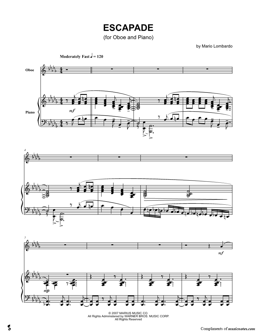 2. Escapade - Oboe Part (click here to preview and play this piece) Composer: Scored For:Instrumental Part Instrument:Oboe, range: Db4-B5 Number of pages:3 Click here to purchase this piece separately for $4.99 |