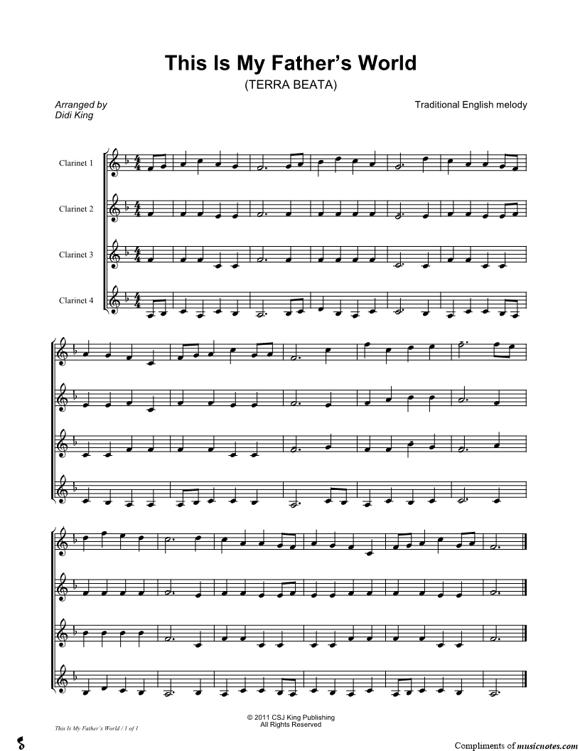 1. This Is My Father's World - Score (Clarinet Quartet) (click here to preview and play this piece) Composer: Scored For:Score, Instrumental Quartet and Clarinet Choir Instruments:Clarinet 1, range: C4-F5, Clarinet 2, range: C4-Bb4, Clarinet 3, range: C4-Bb4 and Clarinet 4, range: A3-D4 Number of pages:1 Click here to purchase this piece separately for $4.99 |