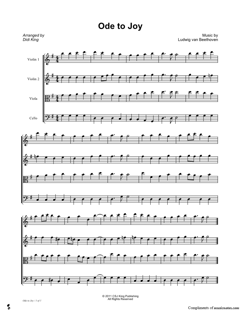 1. Ode to Joy - String Quartet Score (click here to preview and play this piece) Composer: Lyricist: Scored For:String Quartet and Score Instruments:Violin 1, range: D4-D5, Violin 2, range: C4-G4, Viola, range: F#4-D5 and Cello, range: G2-G3 Number of pages:1 Click here to purchase this piece separately for $4.99 |
