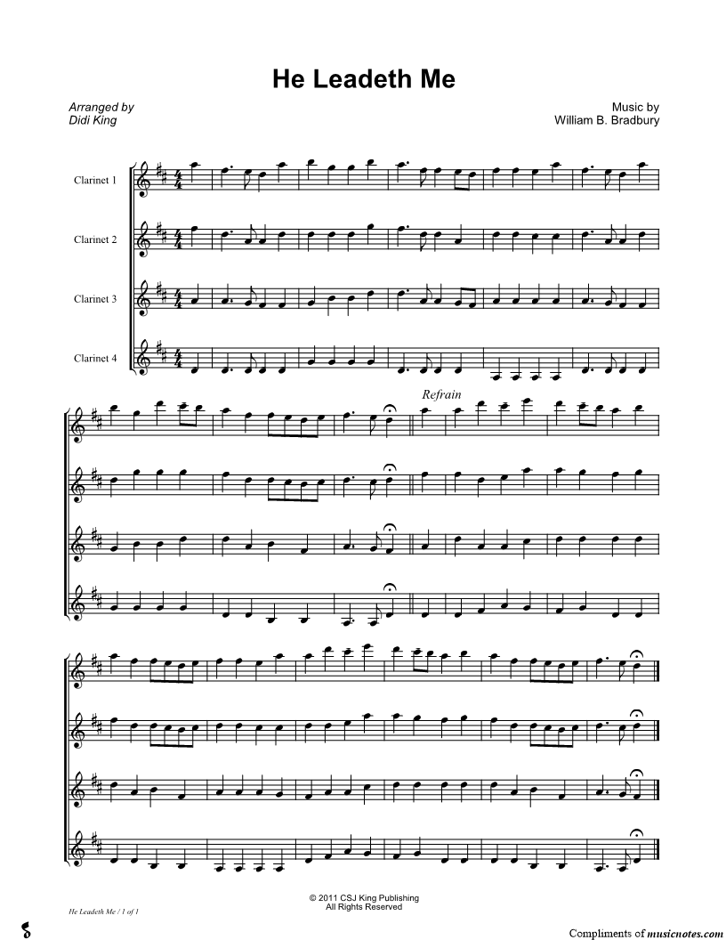 1. He Leadeth Me - Clarinet Quartet Score (click here to preview and play this piece) Composer: Lyricist: Scored For:Score and Clarinet Choir Instruments:Clarinet 1, range: D5-E6, Clarinet 2, range: A4-A5, Clarinet 3, range: F#4-D5 and Clarinet 4, range: A3-A4 Number of pages:1 Click here to purchase this piece separately for $4.99 |