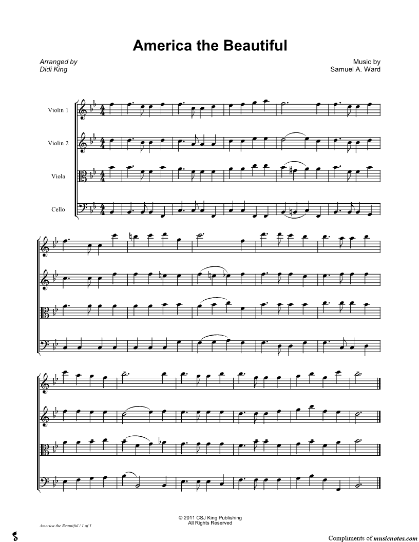 1. America the Beautiful - String Quartet Score (click here to preview and play this piece) Composer: Lyricist: Scored For:String Quartet and Score Instruments:Violin 1, range: C5-D6, Violin 2, range: A4-Bb5, Viola, range: F4-C5 and Cello, range: F2-Bb3 Number of pages:1 Click here to purchase this piece separately for $4.99 |