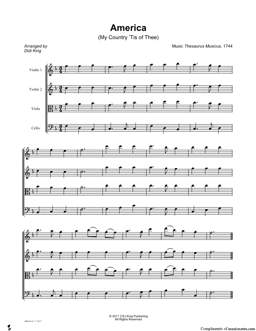 1. America (My Country 'Tis of Thee) - String Quartet Score (click here to preview and play this piece) Composer: Lyricist: Scored For:Score and String Quartet Instruments:Violin 1, range: E5-D6, Violin 2, range: C5-A5, Viola, range: G4-D5 and Cello, range: Bb2-C4 Number of pages:1 Click here to purchase this piece separately for $4.99 |