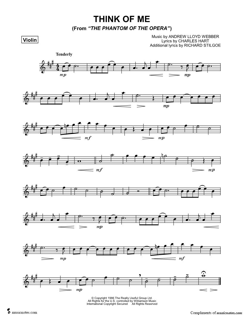 1. Think of Me (click here to preview and play this piece) Composer: Lyricists: Scored For:Instrumental Solo Instrument:Violin, range: F#4-B5 Number of pages:1 Click here to purchase this piece separately for $4.99 |
