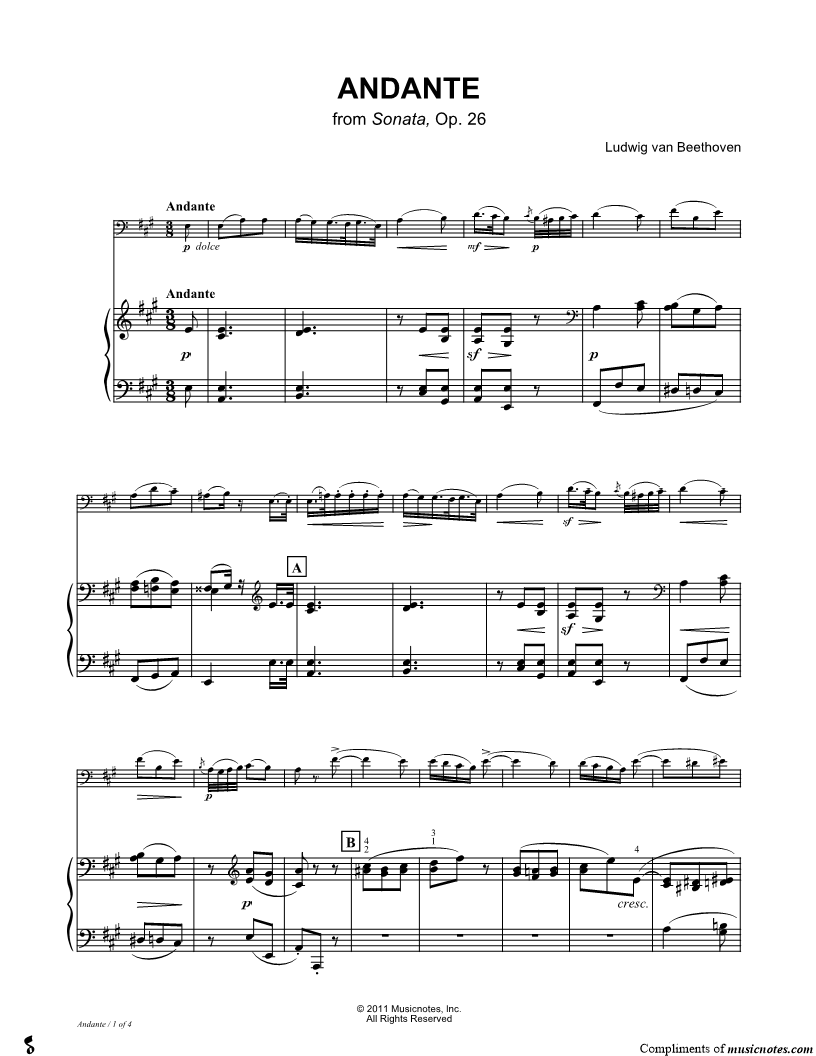1. Andante from Sonata, Op. 26 - Piano Accompaniment (click here to preview and play this piece) Composer: Scored For:Solo & Accompaniment and Instrumental Part Instruments:Cello, range: E3-E5 and Piano Accompaniment Number of pages:4 Click here to purchase this piece separately for $5.99 |