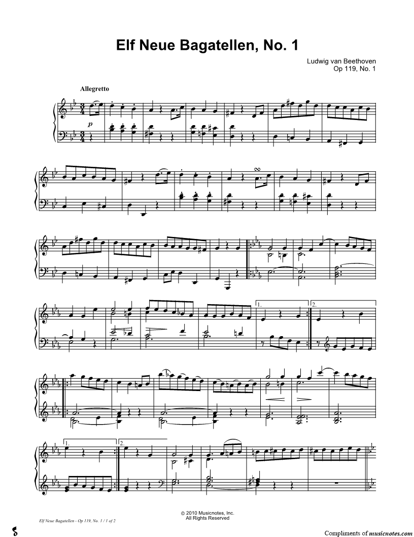 2. Eleven Bagatelles, Op. 119, No. 2 (click here to preview and play this piece) Composer: Scored For:Instrumental Solo Instrument:Piano Number of pages:2 Click here to purchase this piece separately for $5.99 |