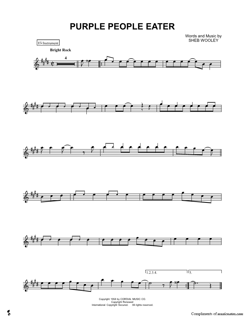 1. Purple People Eater - Eb Instrument (click here to preview and play this piece) Performers: Sheb Wooley and Sha Na Na Composer: Lyricist: Scored For:Instrumental Solo and Instrumental Part Instruments:Eb Instrument, range: B4-B5, Alto Saxophone and Baritone Saxophone Number of pages:1 Click here to purchase this piece separately for $4.99 |