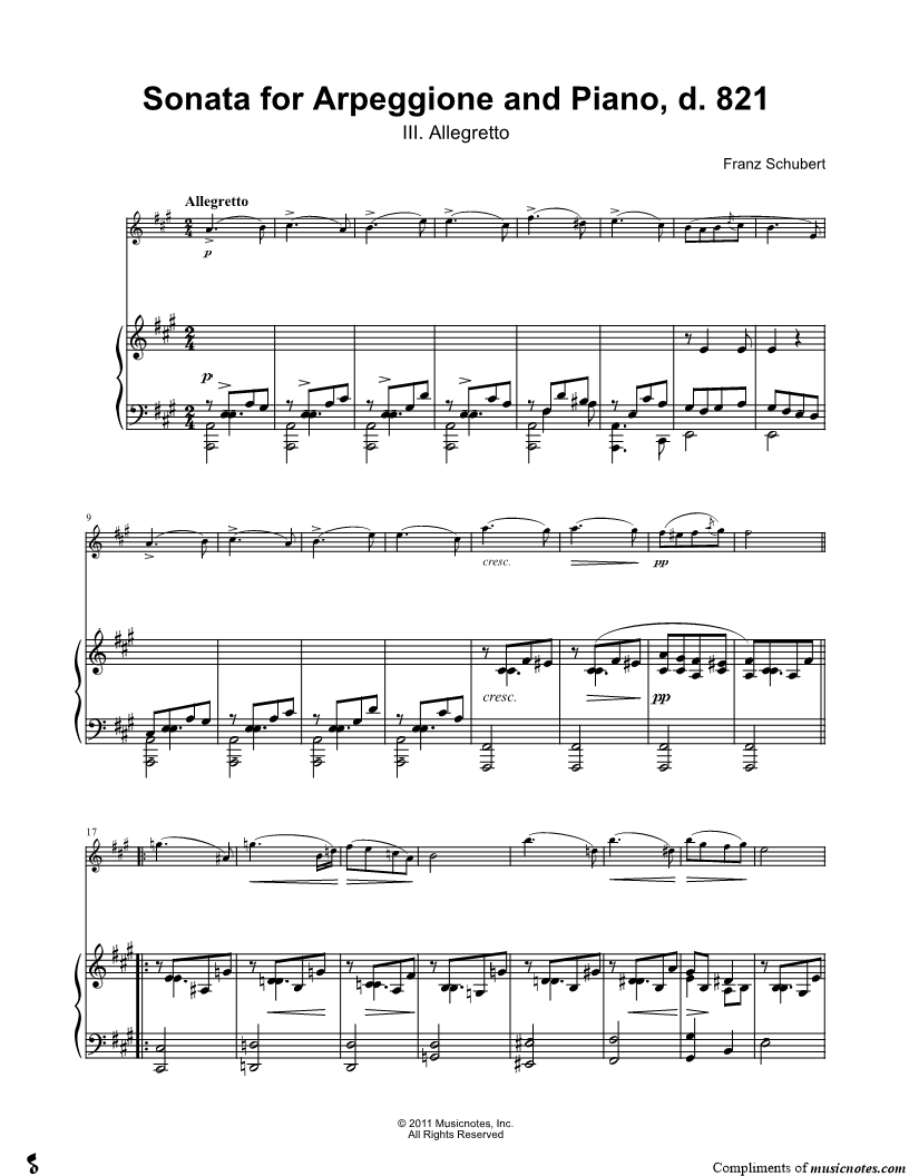1. Sonata for Arpeggione and Piano, d. 821: III. Allegretto - Piano part (click here to preview and play this piece) Composer: Scored For:Solo & Accompaniment and Instrumental Part Instruments:Piano Accompaniment, C Instrument, range: E3-A6, Oboe, Violin, Recorder and Flute Number of pages:15 Click here to purchase this piece separately for $5.99 |