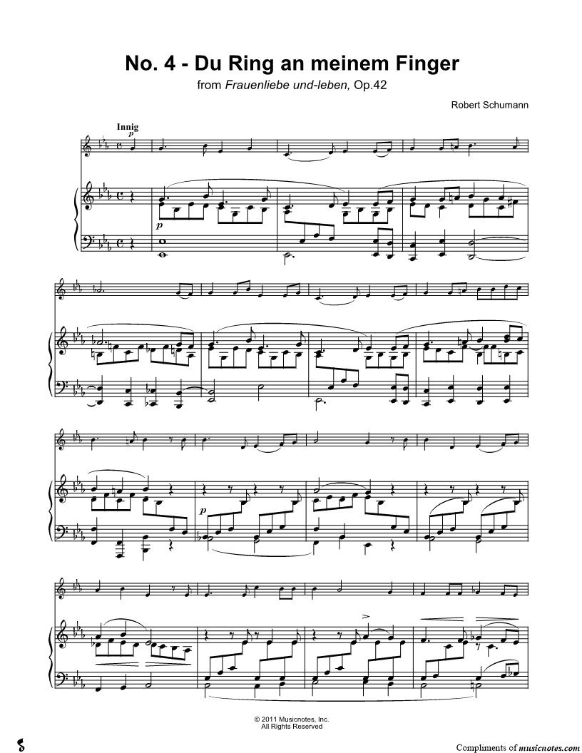 1. Du Ring An Meinem Finger - Instrumental Score (click here to preview and play this piece) Composer: Scored For:Solo & Accompaniment and Instrumental Part Instruments:Piano Accompaniment, C Instrument, range: C4-F5, Flute, Recorder, Violin and Oboe Number of pages:3 Click here to purchase this piece separately for $5.99 |